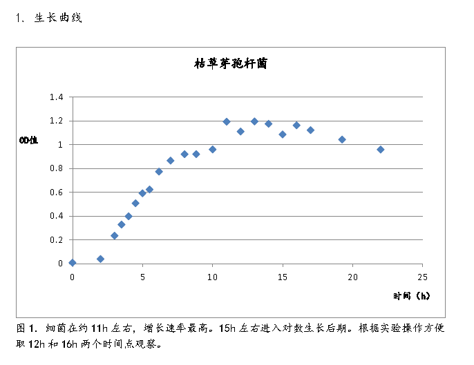 1、 將枯草芽孢桿菌在5ml NA液體培養(yǎng)基中活化,活化的菌種接種于100ml NA液體培養(yǎng)基中,37℃搖床中培養(yǎng),接種后立即取0.1ml測量OD值,后連續(xù)22h取菌液測其OD值,并繪制實(shí)驗(yàn)菌株的生長曲線。