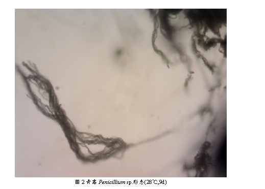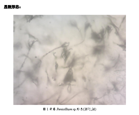 青霉采用玻璃紙法在PDA培養基上接種,28℃培養。第2天即可看到青霉產孢,產孢量較大。青霉菌屬多細胞,營養菌絲體無色或淡色。菌絲有橫隔,分生孢子梗亦有橫隔,光滑或粗糙。基部無足細胞,頂端不形成膨大的頂囊,其分生孢子梗經過多次分枝,產生幾輪對稱或不對稱的小梗,形如掃帚,稱為帚狀體。分生孢子球形,生長時呈藍綠色。培養一周后,可看到明顯的孢子脫落。連續觀察2周,仍然可以觀察到青霉的產孢結構,分生孢子易觀察。
