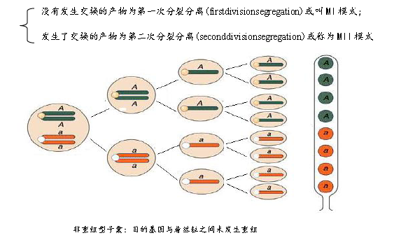 著絲粒作圖是基于這樣的事實(shí):減數(shù)分裂中在同源染色體的一對非姊妹染色單體的著絲粒和某雜合基因座間有沒有發(fā)生交換,和其產(chǎn)物四分子中的等位基因在排列方式上是不同的??煞譃閮煞N: