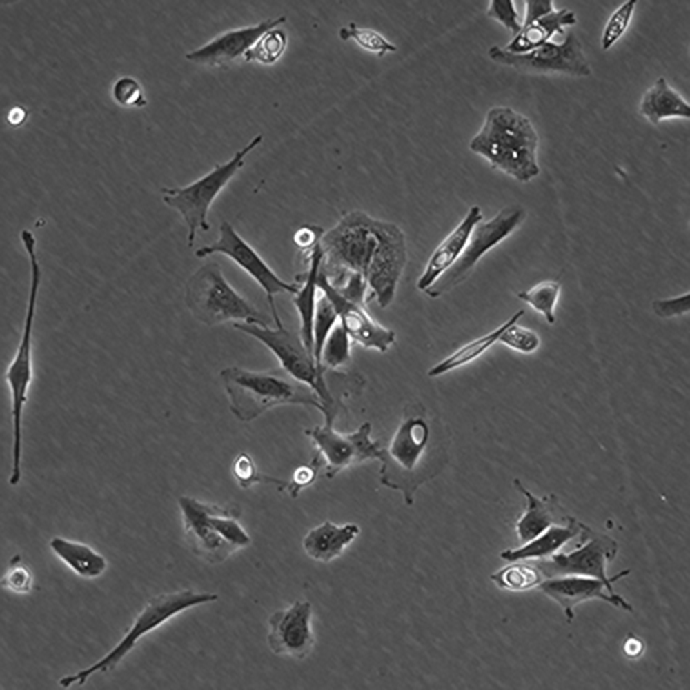 如果細胞密度達80%-90%,即可進行傳代培養。1. 棄去培養上清,用不含鈣、鎂離子的PBS潤洗細胞1-2次。2. 加2ml消化液(0.25%Trypsin-0.53mM EDTA)于培養瓶中,置于37℃培養箱中消化1-2分鐘,然后在顯微鏡下觀察細胞消化情況,若細胞大部分變圓并脫落,迅速拿回操作臺,輕敲幾下培養瓶后加少量培養基終止消化。3. 按6-8ml/瓶補加培養基,輕輕打勻后吸出,在1000RPM條件下離心4分鐘,棄去上清液,補加1-2mL培養液后吹勻。4. 將細胞懸液按1:2到1:5的比例分到新的含8ml培養基的新皿中或者瓶中。 |